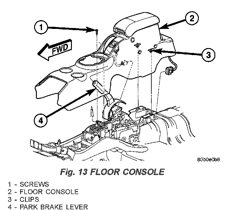 6. Remove screws, next to floor shifter and in console storage compartment, attaching floor console to brackets on floor pan (Fig. 12).