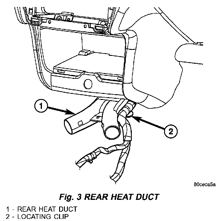 12. Using a trim stick (special tool #C-4755) or equivalent, gently pry out on the left and right rear floor heat ducts and remove (Fig. 3).