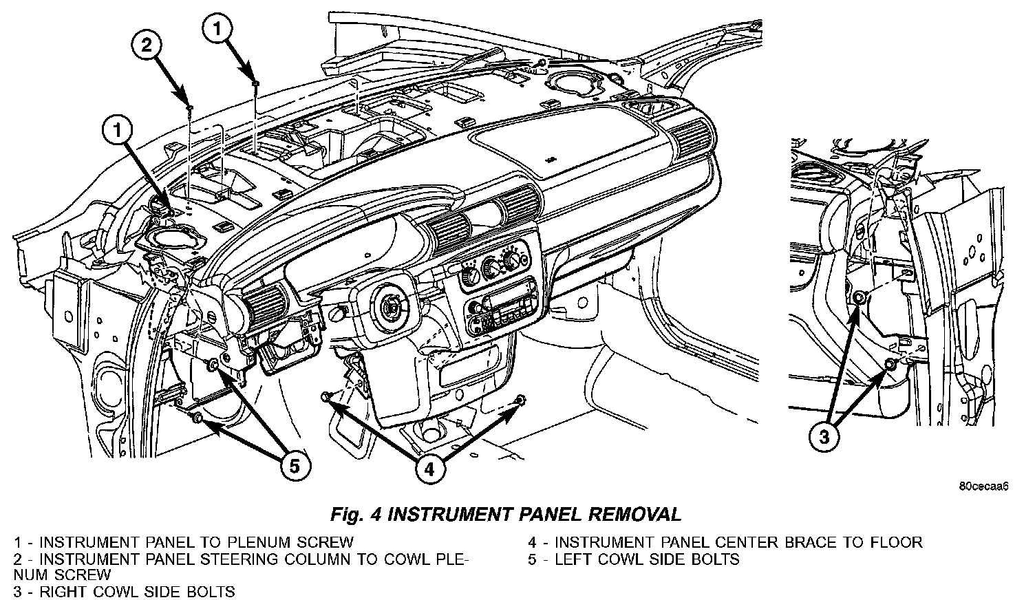 2. Install the seven bolts and five screws attaching instrument panel to fence line and cowl side (Fig. 4).