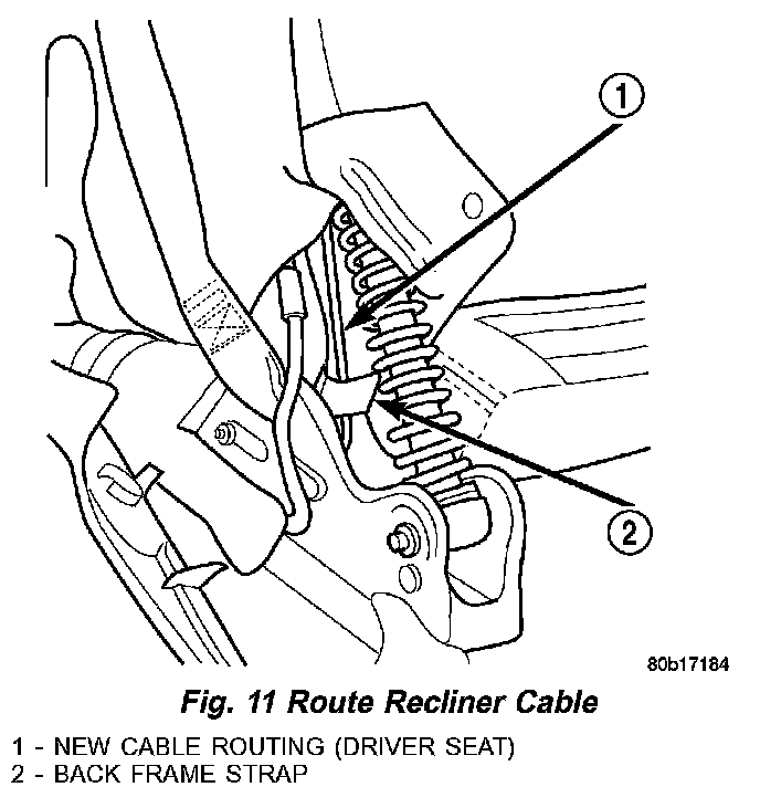 2. Route recliner cable in front of metal strap at bottom of the seat back frame (Fig. 11).