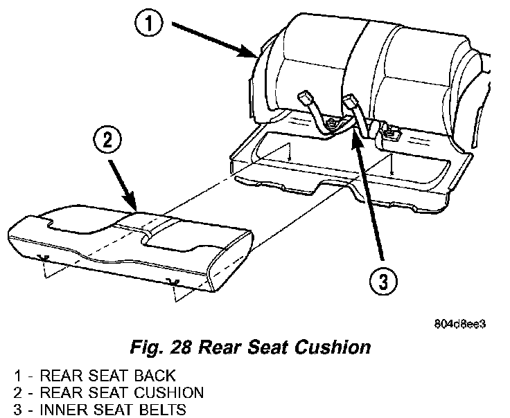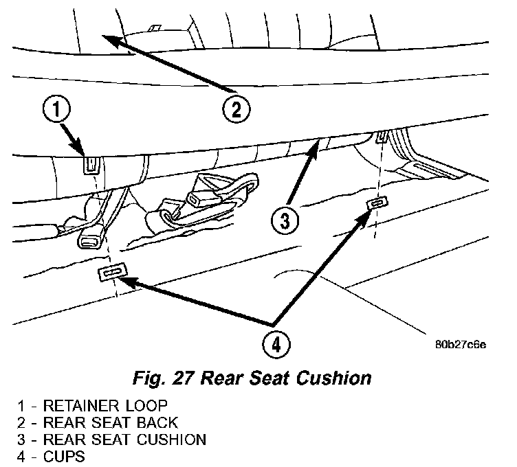 1. Pull upward at forward edge of cushion each retainer loop of the rear seat cushion to disengage retainer loops from cups in floor (Fig. 27).