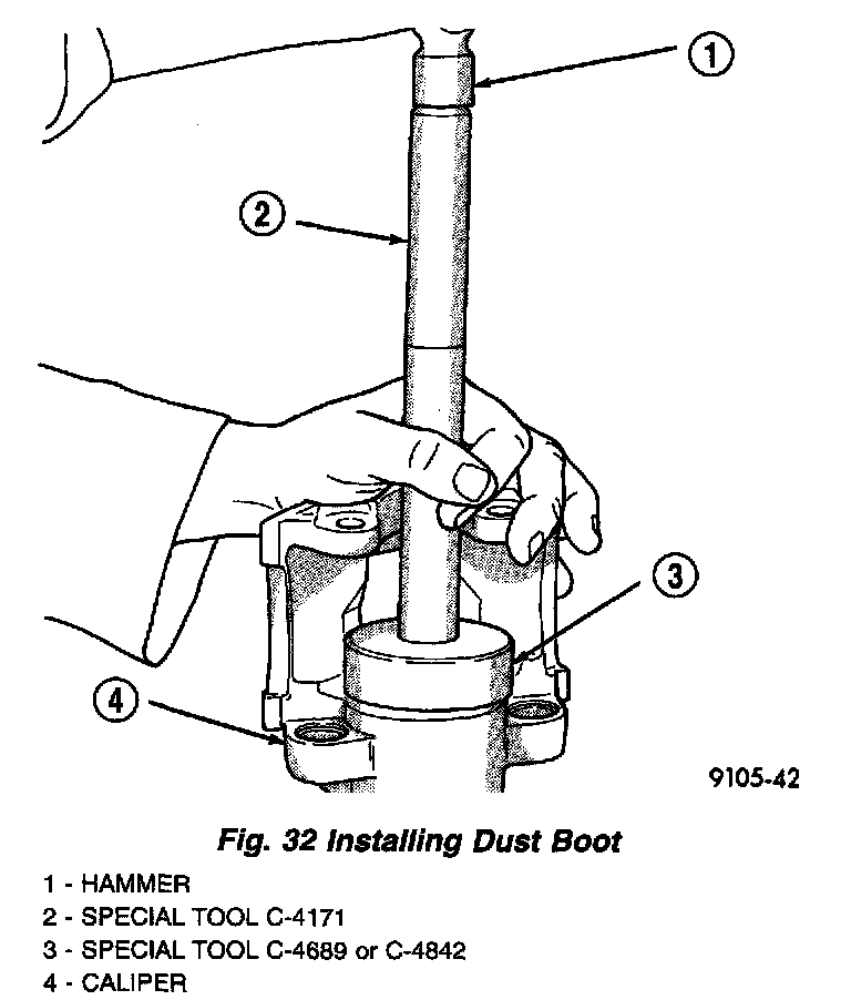 6. Using a hammer and Installer, Special Tool C-4689 or C-4842 (depending on piston size), and Handle, Special Tool C-4171, drive the boot into the counterbore of the caliper as necessary.