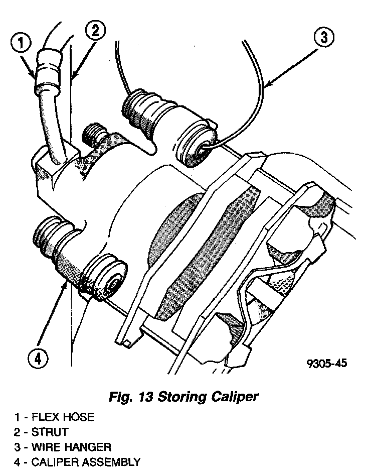 5. Support caliper from rear strut to prevent weight of caliper from damaging the flexible brake hose.