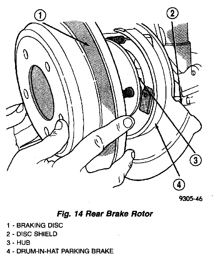 6. Remove rear rotor from hub/bearing. Then inspect drum-in-hat parking brake shoes and parking brake braking surface on rotor for any signs of excessive wear or damage. Replace parking brake shoes if required.