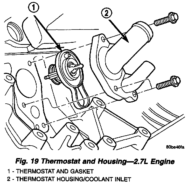 The engine cooling thermostat is a wax pellet driven, reverse poppet choke type. The thermostat is designed to provide the fastest warm up possible by preventing leakage through it and to guarantee a minimum engine operating temperature of 88 to 93°C (192 to 199°F). The thermostat also will automatically reach wide open so it will not restrict flow to the radiator as temperature of the coolant rises in hot weather to around 104°C (220°F). Above this temperature the coolant temperature is controlled by the radiator, fan, and ambient temperature, not the thermostat.