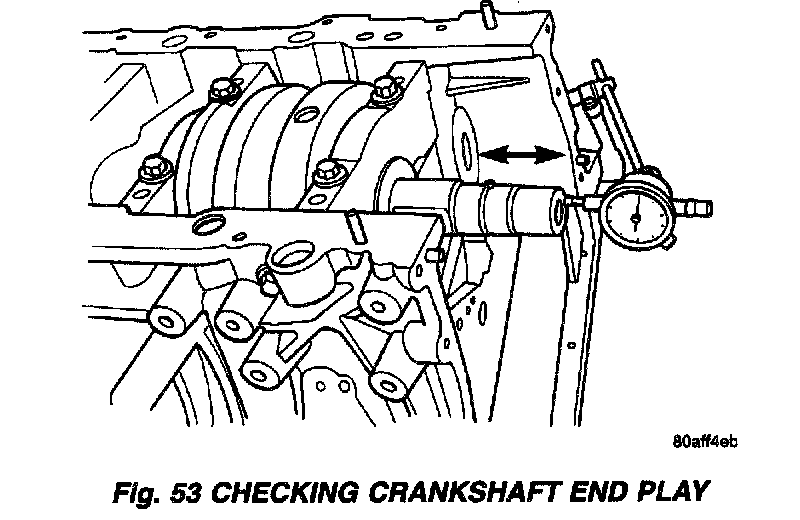 CRANKSHAFT END PLAY1. Mount a dial indicator to a stationary point at front of engine. Locate the probe perpendicular against nose of crankshaft (Fig. 53).