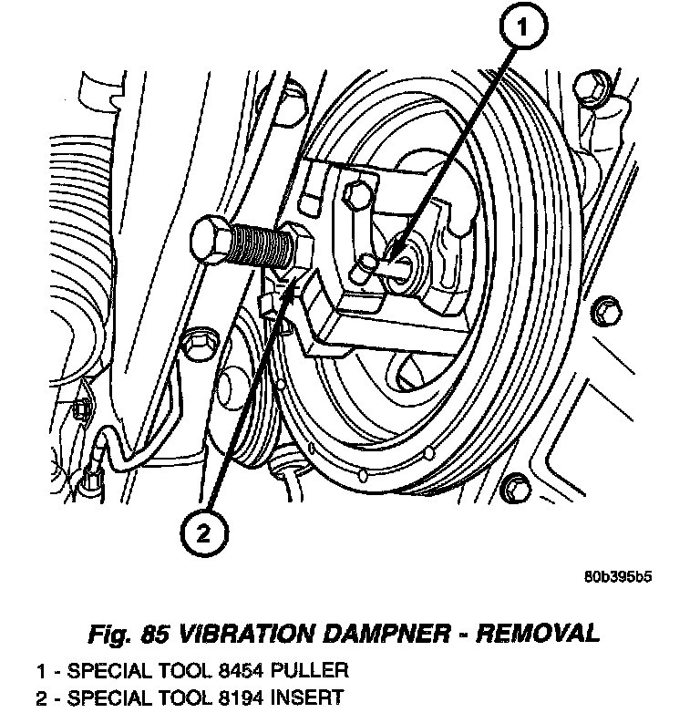 6. Remove dampener by using Special Tools 8194 Insert and 8454 Puller (Fig. 85).