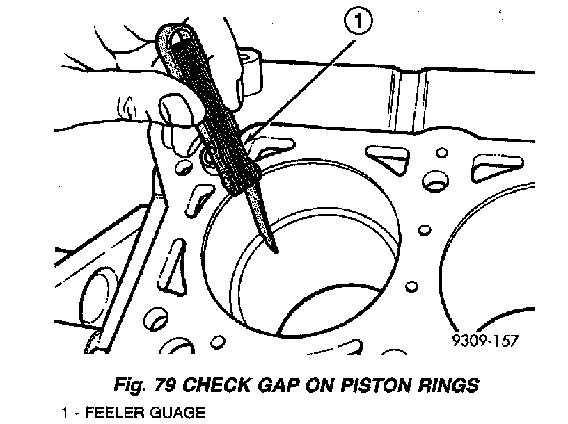 PISTON RING FITTING1. Wipe cylinder bore clean. Insert ring and push down with piston to ensure it is square in bore. The ring gap measurement must be made with the ring positioning at least 12 mm (0.50 inch) front bottom of cylinder bore. Check gap with feeler gauge (Fig. 79). Refer to SPECIFICATIONS for clearance measurements.