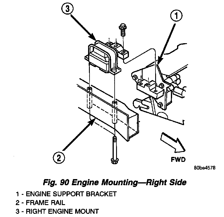 5. Remove the right engine support assembly vertical fasteners from frame rail (Fig. 90).