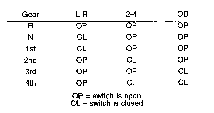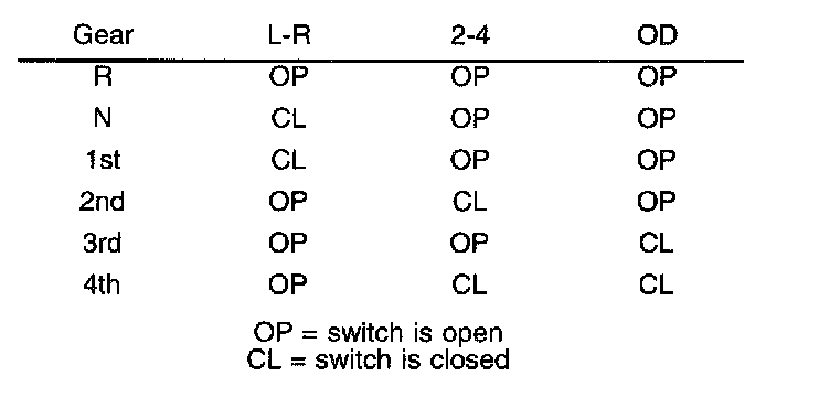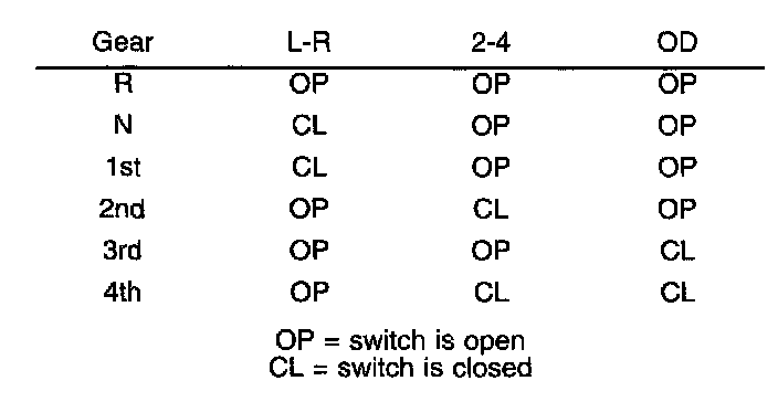 Theory of operation: The Transmission system uses three pressure switches to monitor the fluid pressure in the L-R, 2-4, and OD clutch circuits. The pressure switches are continuously monitored for the correct states in each gear as shown below.