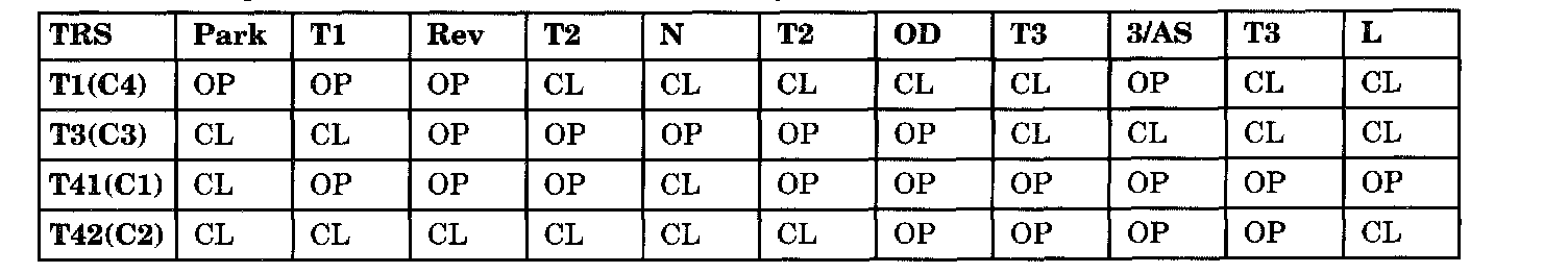 Theory of operation: The Transmission system uses three pressure switches to monitor the fluid pressure in the L-R, 2-4, and OD elements. The pressure switches are continuously monitored for the correct states in each gear as shown below.