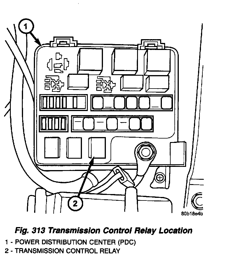 The transmission control relay (Fig. 313) is located in the Power Distribution Center (PDC), which is located on the left side of the engine compartment.