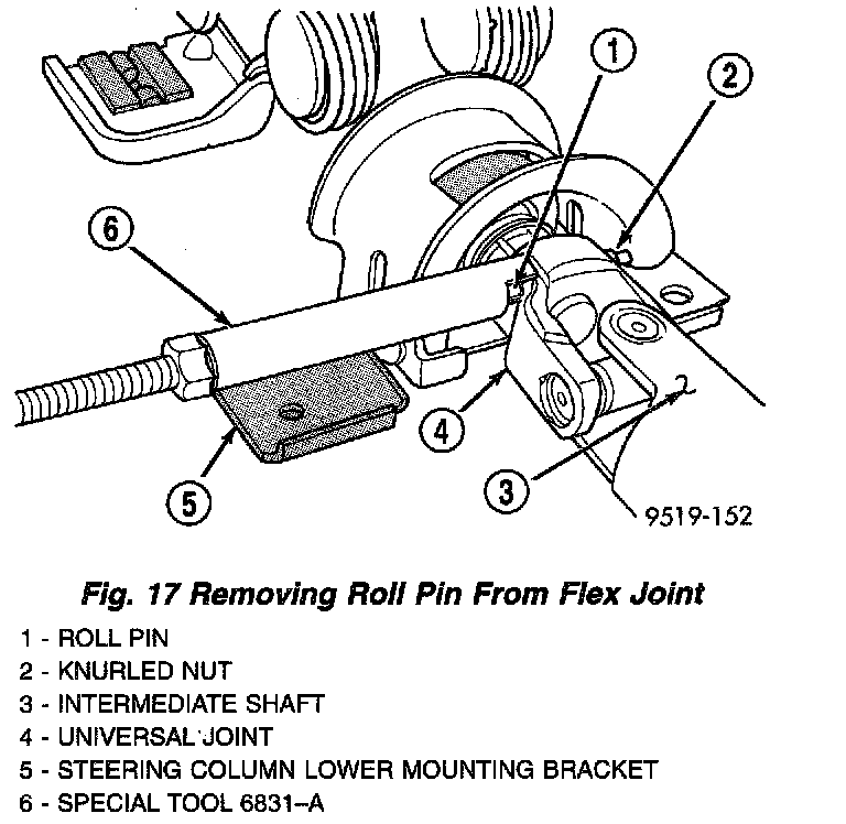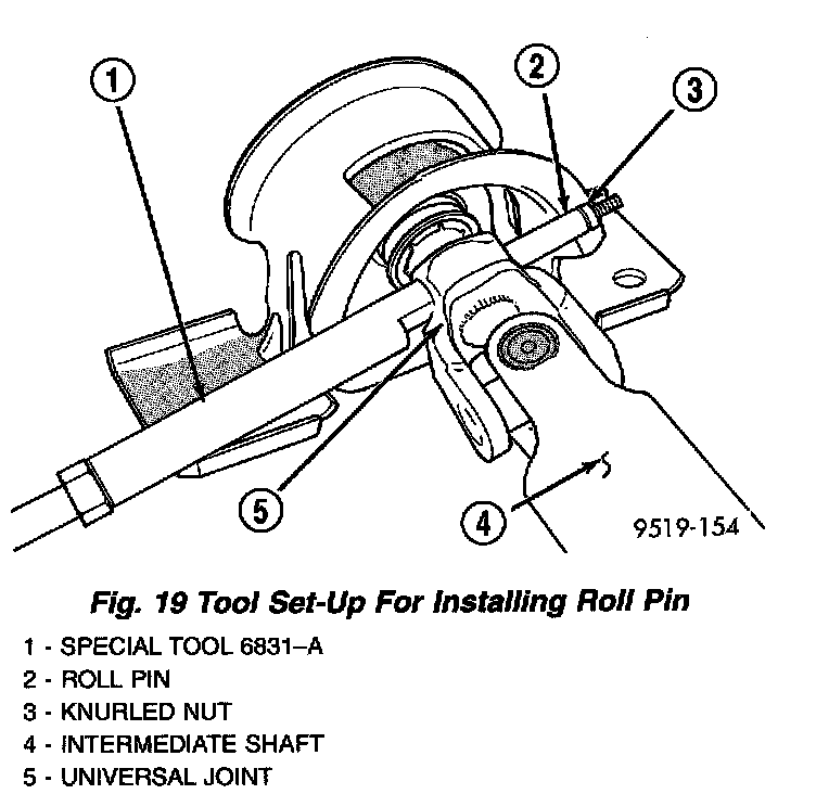 2. Install Remover/Installer, Special Tool 6831-A, through center of roll pin in intermediate shaft's universal joint and install knurled nut.