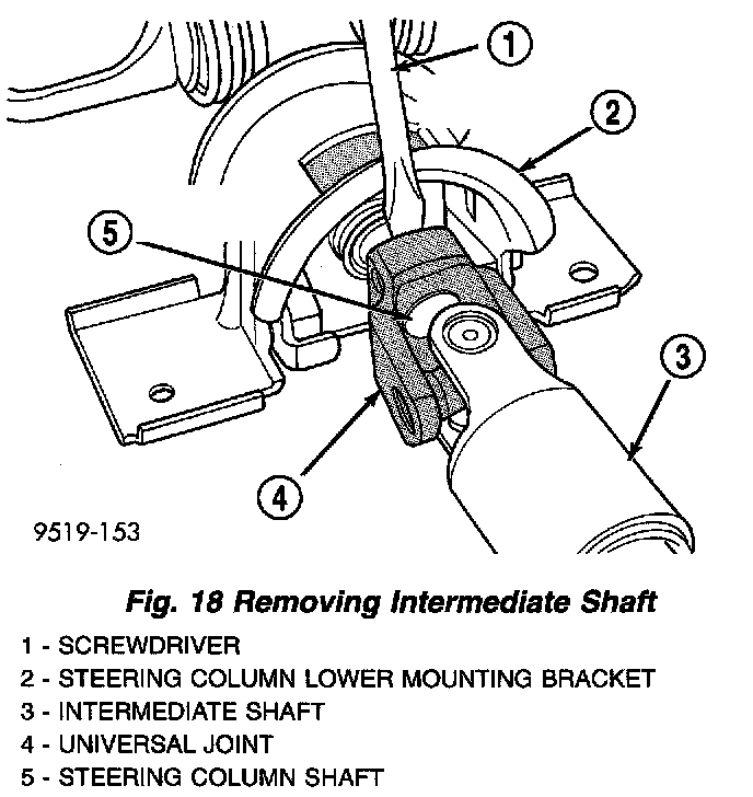 4. Using a screwdriver inserted between the shaft's universal joint and the steering column lower mounting bracket, pry intermediate shaft off steering column shaft.