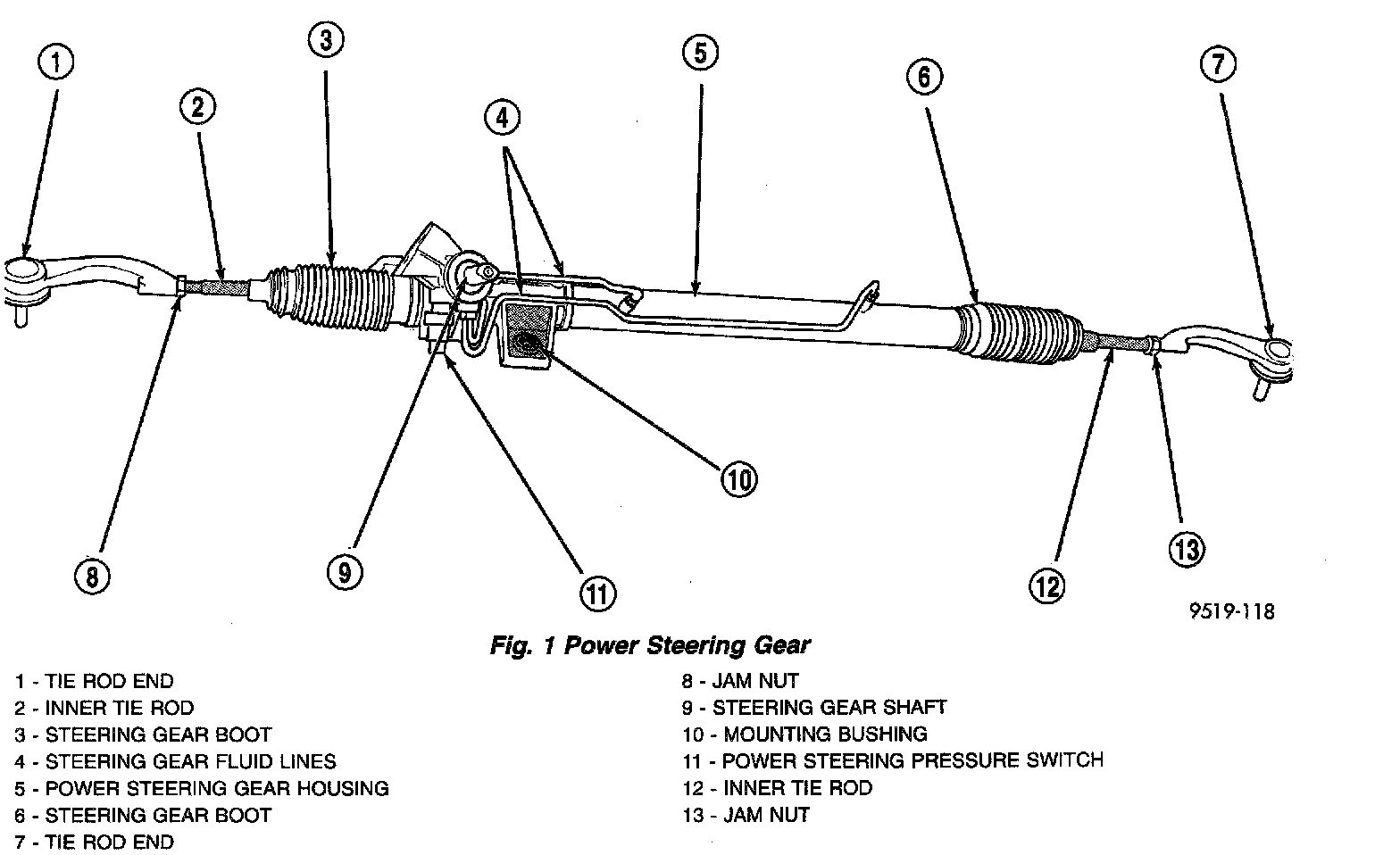 DESCRIPTIONThe steering gear on this vehicle is a rack and pinion unit with power assist. It is mounted on the front suspension crossmember. The steering column connects to the steering gear shaft on top of the gear. The outer tie rod ends of the gear connect to each suspension steering knuckle to steer the vehicle.