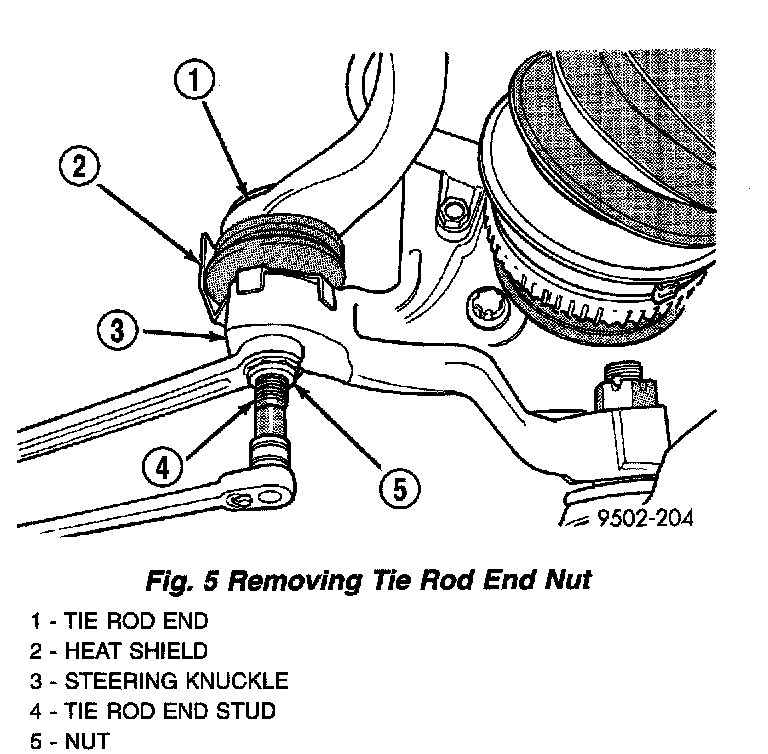 7. Remove nuts attaching both outer tie rod ends to the steering knuckles. Nuts are to be removed from tie rod ends using the following procedure, hold tie rod end stud with an 11/32 socket, while loosening and removing nut with wrench.