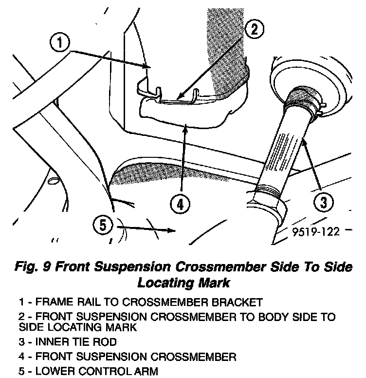 NOTE: Use the following procedure to mark the side to side and front to back installed location of the front suspension crossmember to the body of the vehicle.