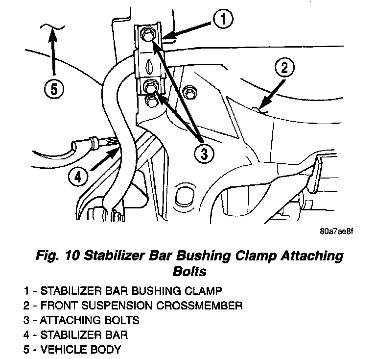 11. Remove the stabilizer bar bushing clamp to body attaching bolts only. The sway bar bushing clamp to front suspension crossmember bolts do not need to be removed