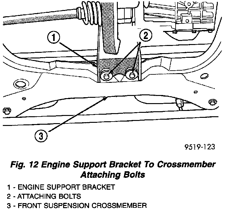 15. Remove the 2 bolts attaching the under engine support bracket to the front edge of the front suspension crossmember.