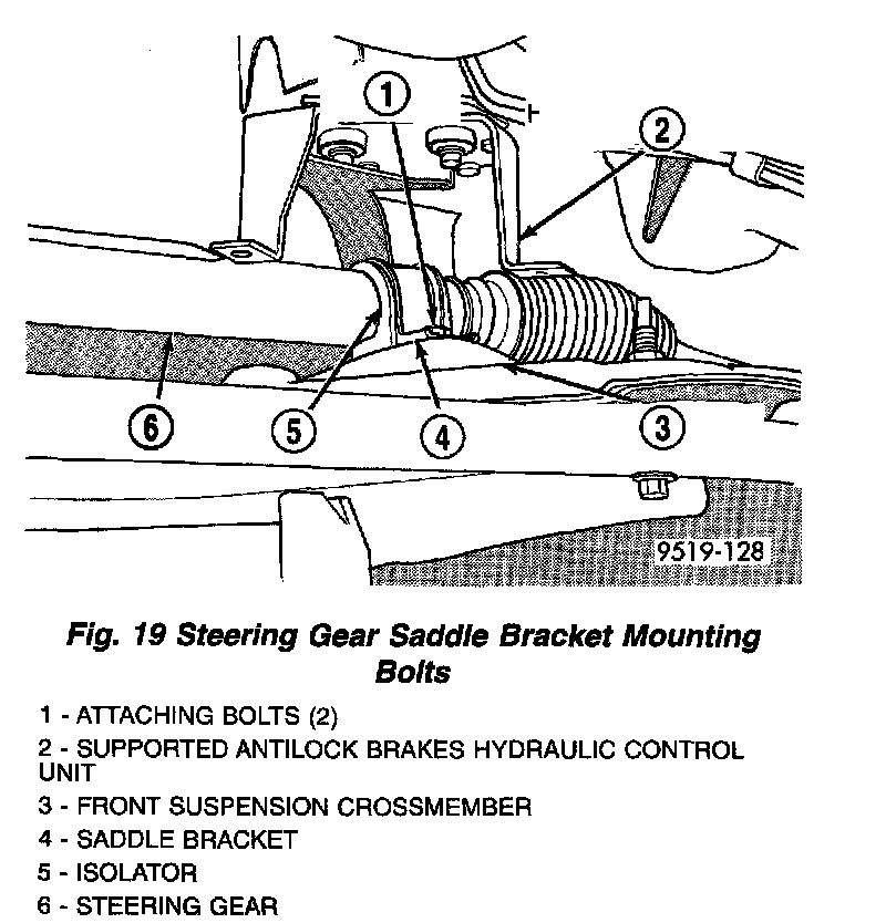 23. Remove the 2 bolts, at the isolators and attaching the steering gear assembly to front suspension crossmember. Then remove the 2 bolts attaching the steering gear saddle bracketto the front suspension crossmember. Remove the steering gear assembly from the front suspension crossmember