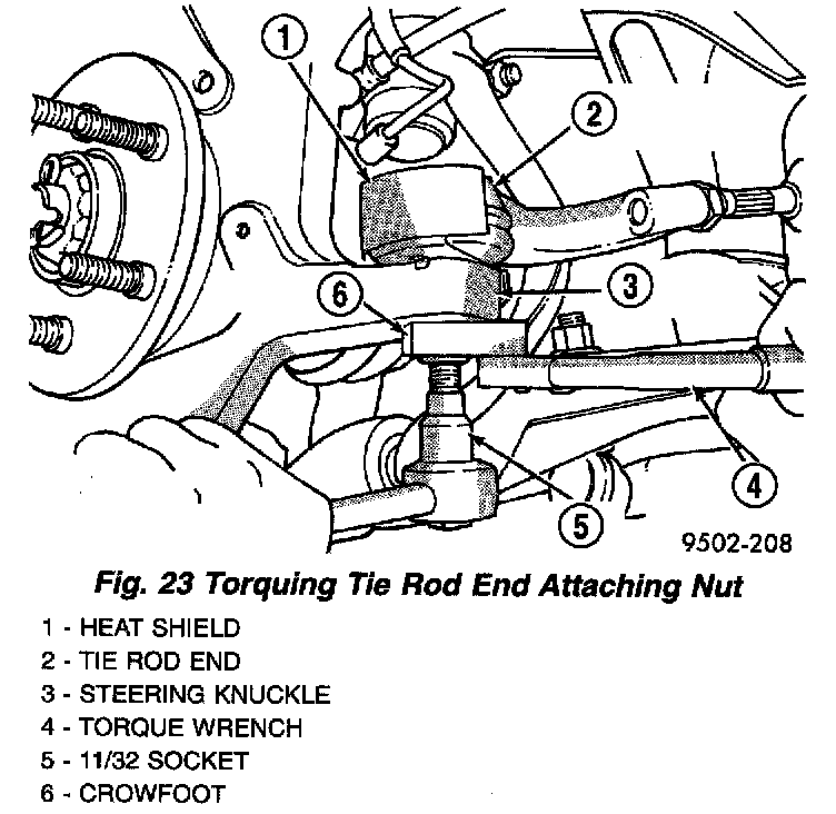 12. Install tie rod end into steering knuckle. Start tie rod end to steering knuckle attaching nut onto stud of tie rod end. While holding stud of tie rod end stationary, tighten tie rod end to steering knuckle attaching nut. Then using a crowfoot and 11/32 socket, torque tie rod end attaching nut to 55 Nm (40 ft. lbs.).