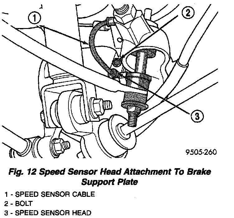 4. If vehicle is equipped with antilock brakes remove the rear wheel speed sensor from the brake support plate and brake flex hose routing bracket.