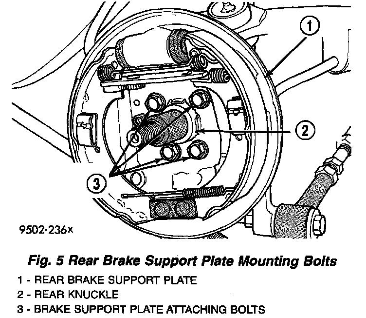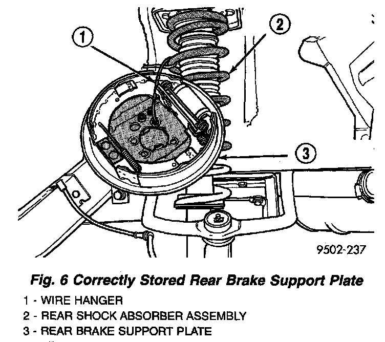 7. Remove the 4 bolts attaching rear brake support plate to knuckle. Then remove brake support plate, brake shoes and wheel cylinder as an assembly from rear knuckle. It is not necessary to remove brake flex hose from wheel cylinder when removing support plate. Brake support plate when removed, must be supported using mechanics wire as shown in the image.