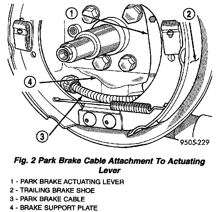8. Install park brake cable into brake support plate. Ensure cable retainer is securely holding cable to support plate. Then connect park brake cable to park brake lever on brake shoe.