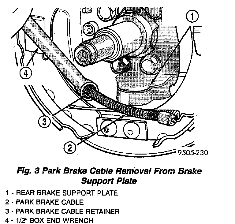 5. Remove the park brake cable from the park brake actuating lever. Then remove the park brake cable from the rear brake support plate. Park brake cable is removed from brake support plate using this procedure. Position a 1/2 inch box end wrench over cable retainer to collapse retaining tabs. Then pull bear brake cable from brake support plate.