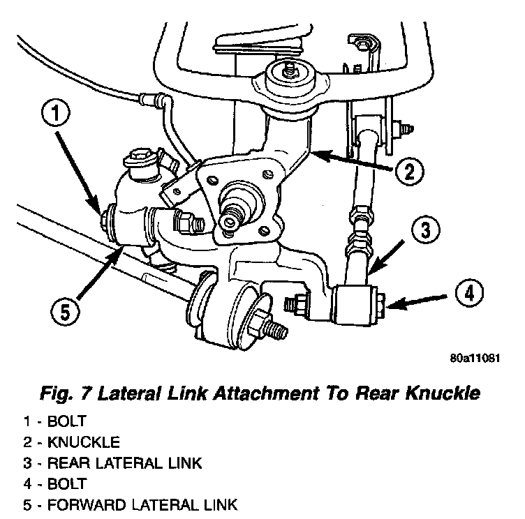 4. Install the front and rear lateral links and attaching nuts and bolts on the knuckle. Tighten the lateral links to knuckle attaching bolts and nuts to 108 Nm (80 ft. lbs.).