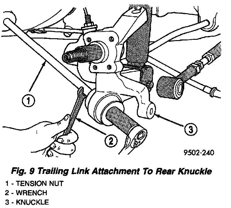 11. Remove the nut and washer attaching the trailing link to the rear knuckle. Use a wrench on the flat of the trailing link to keep it from turning when removing nut.