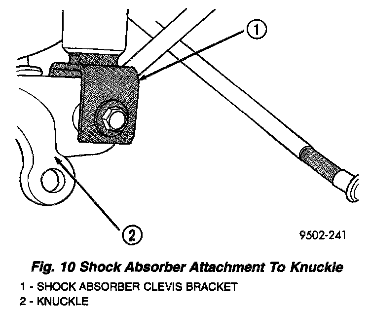 12. Remove the shock absorber clevis bracket to knuckle attaching nut and bolt.