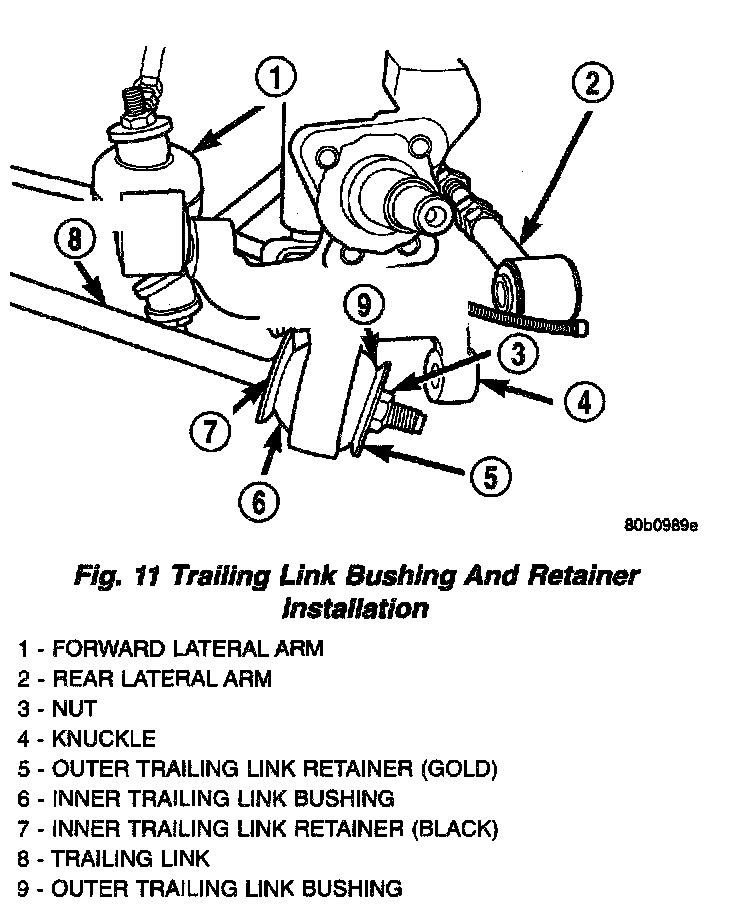 2. Install knuckle on trailing link. Install the trailing link outer bushing, gold bushing retainer and retaining nut on trailing link. Using a large adjustable wrench, to keep trailing link from rotating securely tighten the trailing link retaining nut to a torque of 99 Nm (73 ft. lbs.).