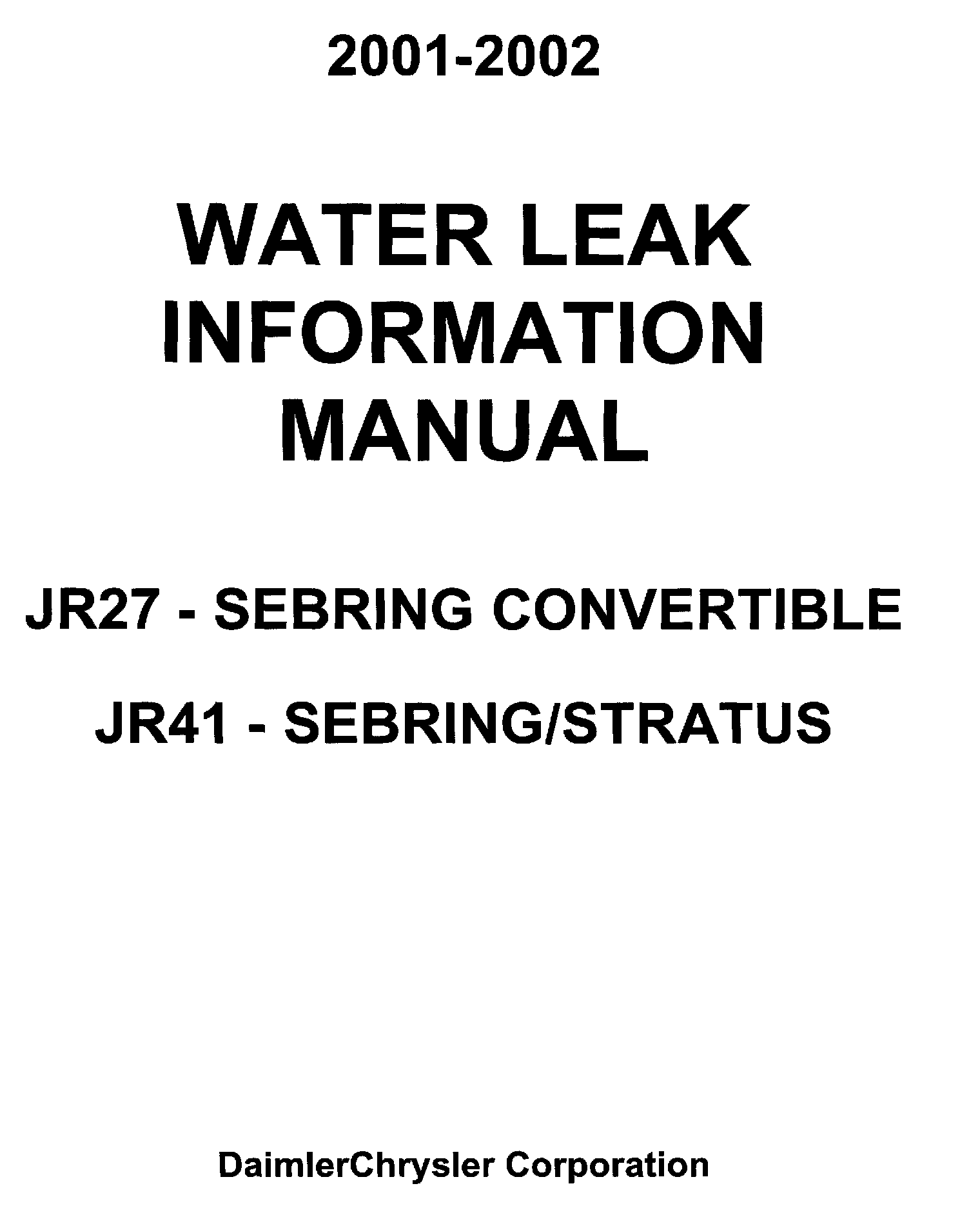 Sebring Convertible/Sebring Sedan/Stratus Sedan Water Leak Information Manual (Publication No. 81-170-00009) is being provided with this Technical Service Bulletin to aid in the diagnosis and repair of water leaks on 2001-2002 JR-vehicles that are unusual and not always apparent. Additional copies of the water leak information manual (Publication No. 81-170-00009) can be ordered from DDS Distribution Services, Ltd. by calling 1-800-890-4038.