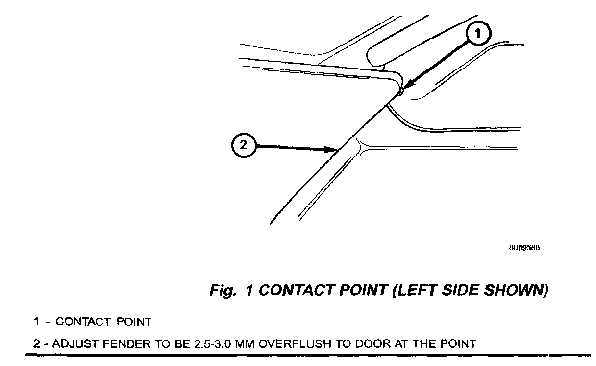 Visually inspect the upper rear corner of the fender for contact with door outer belt molding/weatherstrips, if contact is evident, perform the Repair Procedure (Fig. 1).