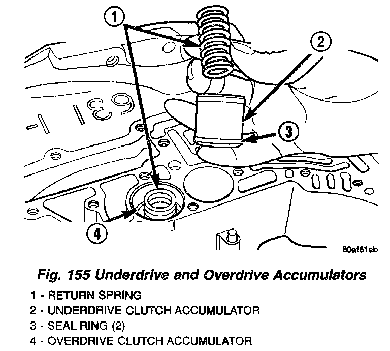 DESCRIPTIONThe 41te underdrive, overdrive, low/reverse, and 2/4 clutch hydraulic circuits each contain an accumulator. An accumulator typically consists of a piston, seals, return spring(s), and a cover or plug. The overdrive and underdrive accumulators are located within the transaxle case, and are retained by the valve body (Fig. 155).