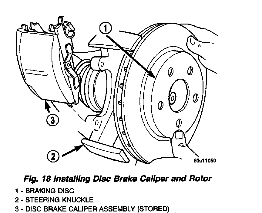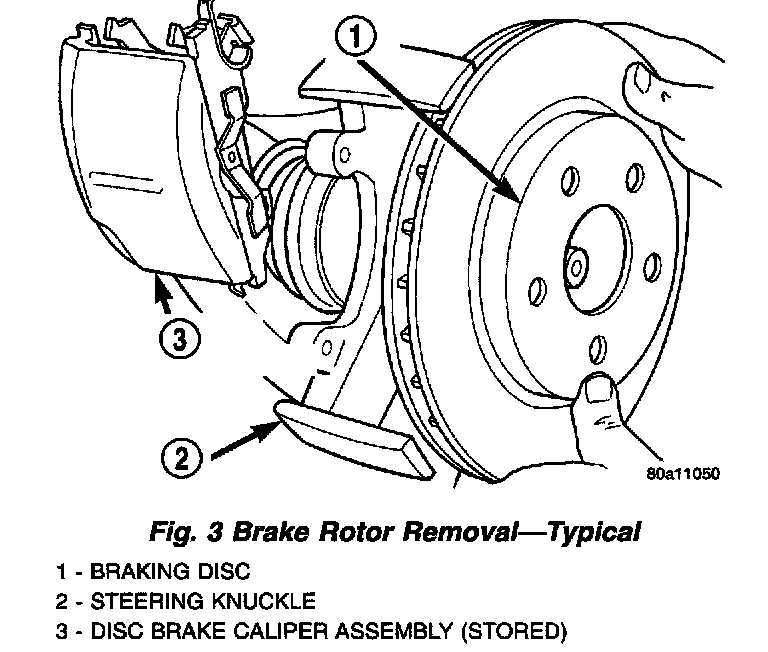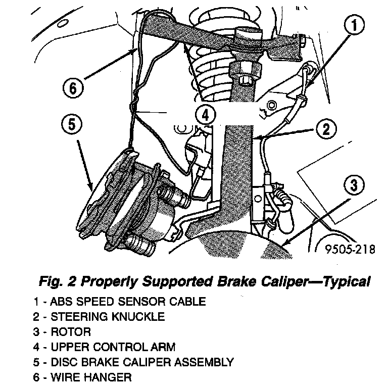 4. Remove caliper/adapter assembly and support with mechanic's wire or equivalent (Fig. 2). Do not support assembly by the flexible brake hose.