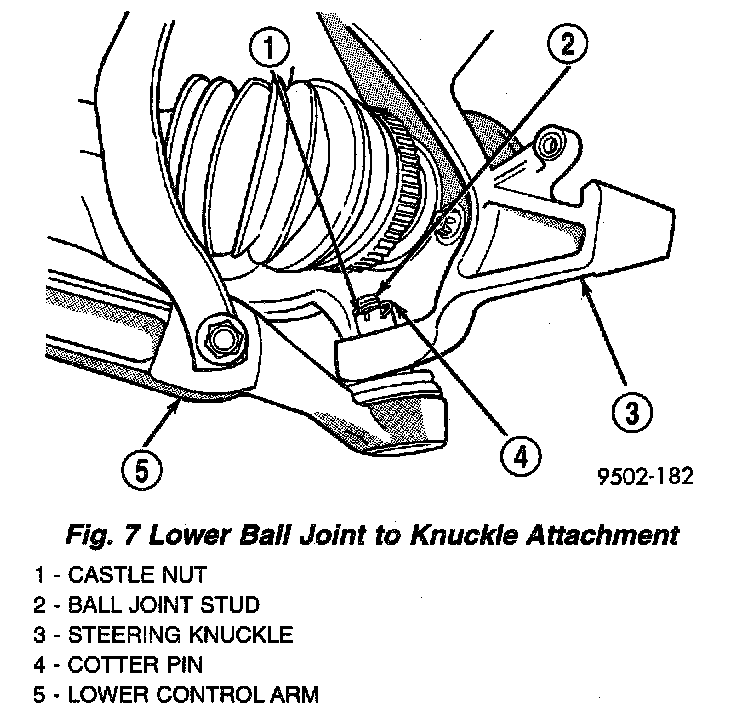 9. Remove cotter pin and castle nut (Fig. 7) from stud of lower ball joint at the steering knuckle.