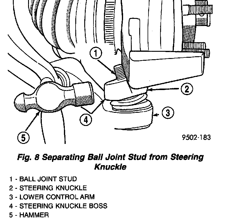 10. Turn steering knuckle so the front of the steering knuckle is facing as far outboard in the wheel well as possible. Using a hammer strike steering knuckle boss until steering knuckle separates from stud of lower ball joint (Fig. 8). When striking steering knuckle, care MUST be taken not to hit lower control arm or ball joint grease seal.