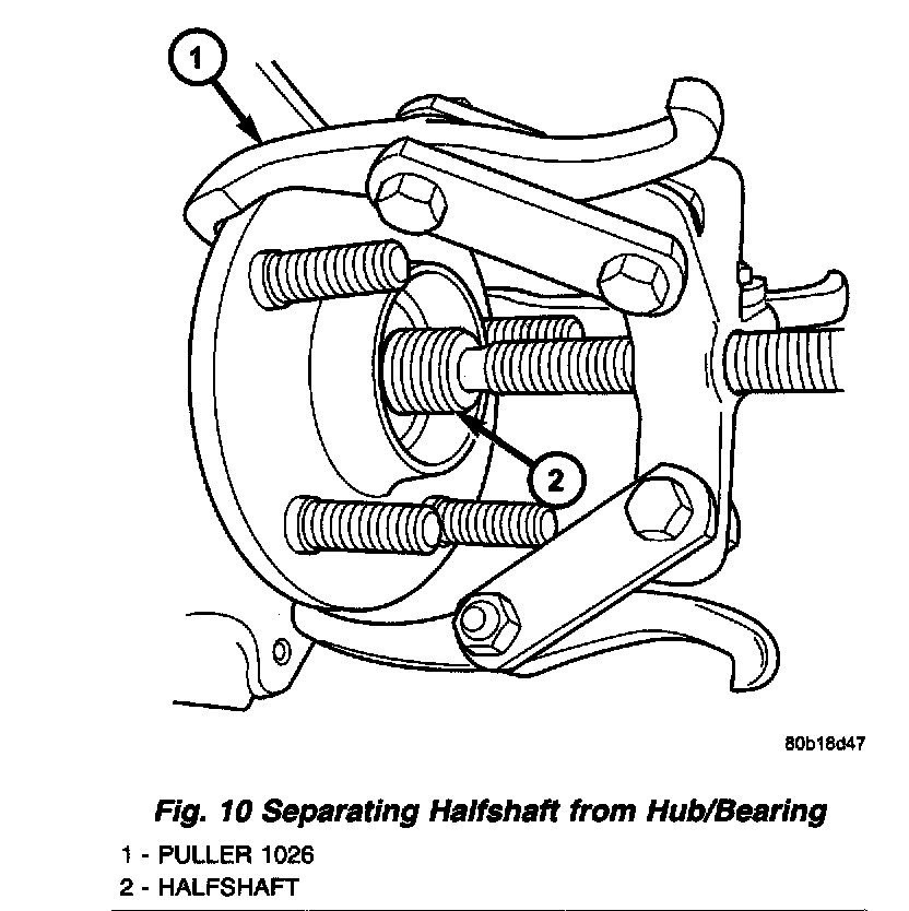 11. Separate halfshaft from steering knuckle (Fig. 9). If difficulty is encountered separating halfshaft from knuckle, DO NOT strike halfshaft with a hammer to break free. Install Puller 1026 (Fig. 10) as shown in to press shaft out of hub/bearing assembly.