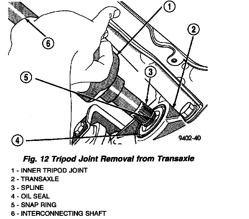 13. Hold inner tripod joint and interconnecting shaft of driveshaft assembly. Remove inner tripod joint from transaxle, by pulling it straight out of transaxle side gear and transaxle oil seal (Fig. 12).