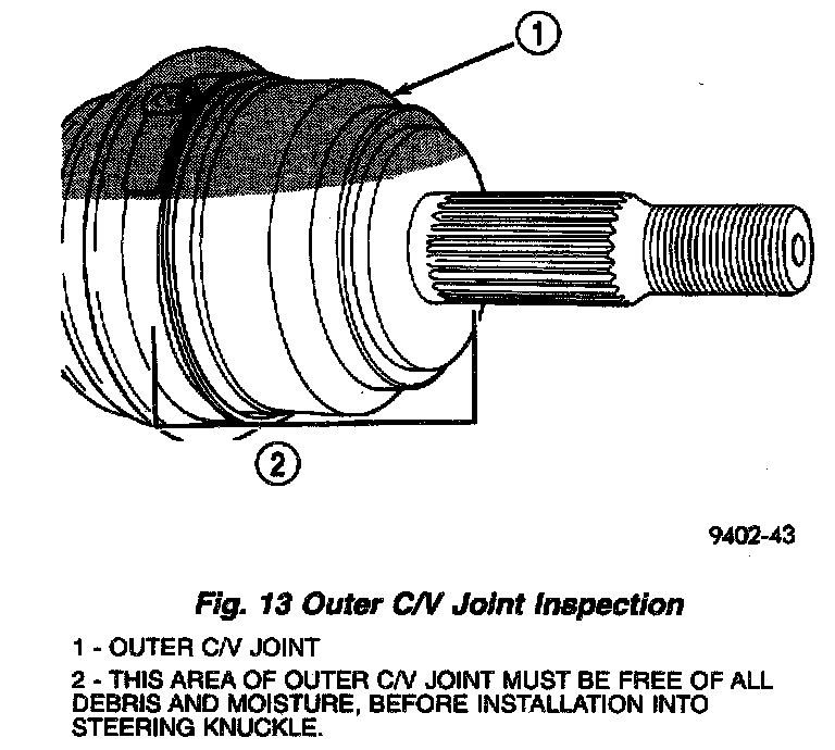 5. Ensure that front of outer C/V joint which fits against the face of the hub and bearing is free of debris and moisture before installing outer C/V joint into hub and bearing assembly (Fig. 13).