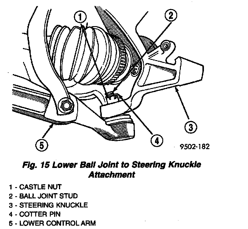 7. Install the steering knuckle to ball joint stud castle nut (Fig. 15). Tighten the castle nut to 95 Nm (70 ft. lbs.).