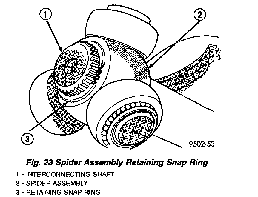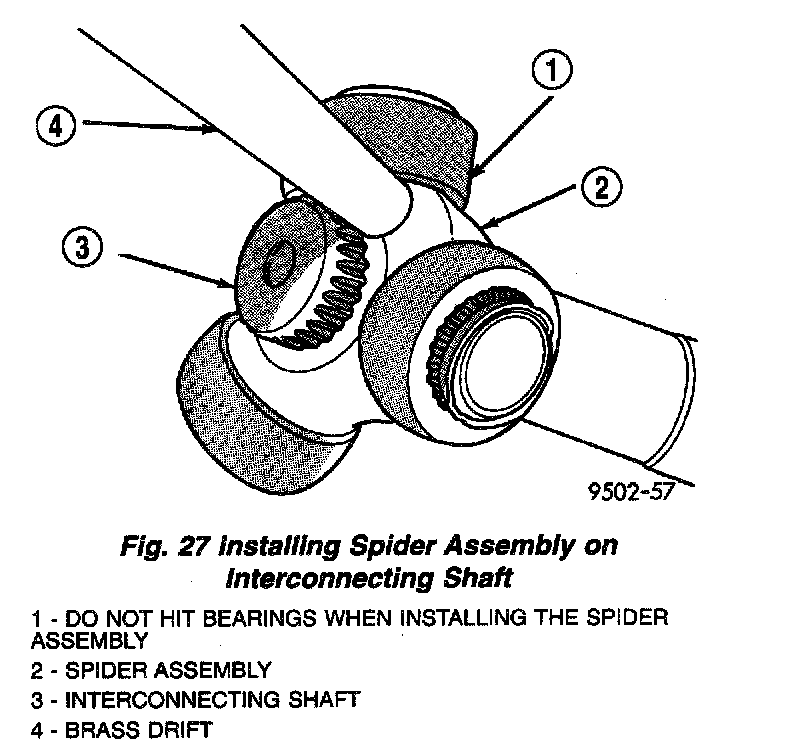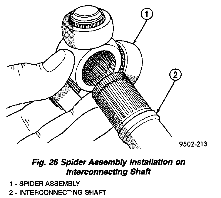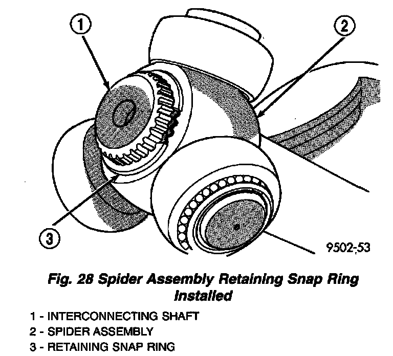 3. Install the spider assembly to interconnecting shaft retaining snap ring into groove on end of interconnecting shaft (Fig. 28). Be sure the snap ring is fully seated into groove on interconnecting shaft.
