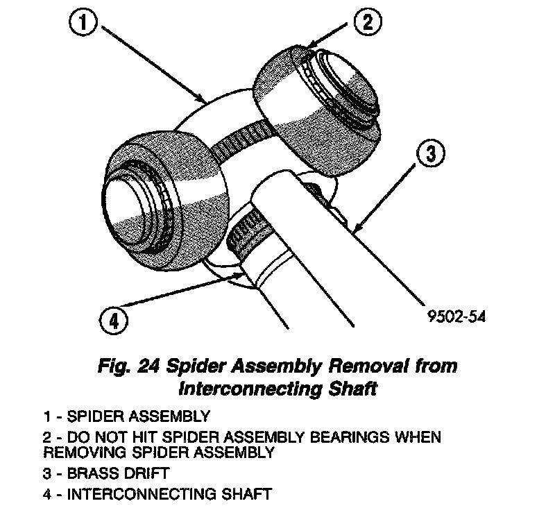 3. Remove snap ring, which retains spider assembly to interconnecting shaft (Fig. 23). Remove the spider assembly from interconnecting shaft. If spider assembly will not come off interconnecting shaft by hand, it can be removed by tapping spider assembly with a brass drift (Fig. 24). Do not hit the outer tripod bearings in an attempt to remove spider assembly from interconnecting shaft