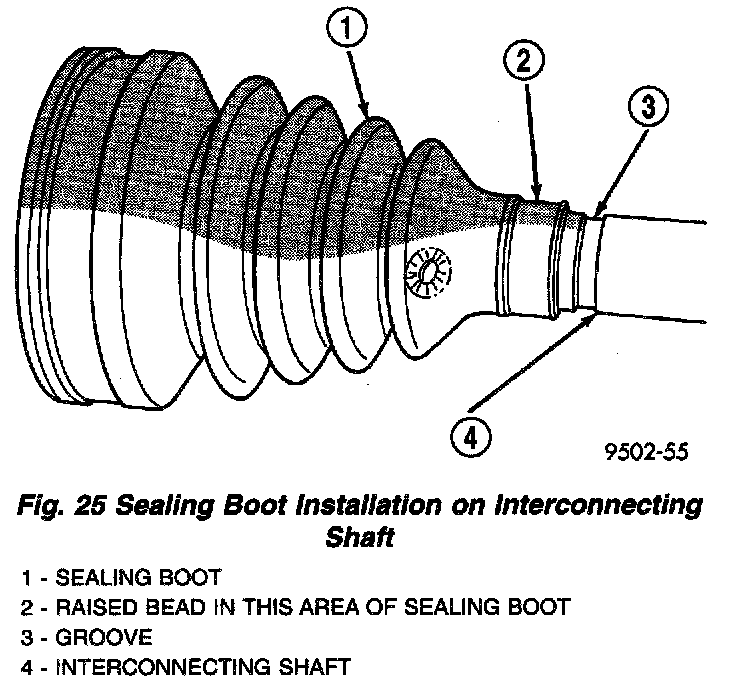 1. Slide inner tripod joint seal boot retaining clamp, onto interconnecting shaft. Then, slide the replacement inner tripod joint sealing boot onto the interconnecting shaft. Inner tripod joint seal boot MUST be positioned on interconnecting shaft, so the raised bead on the inside of the seal boot is in groove on interconnecting shaft (Fig. 25).
