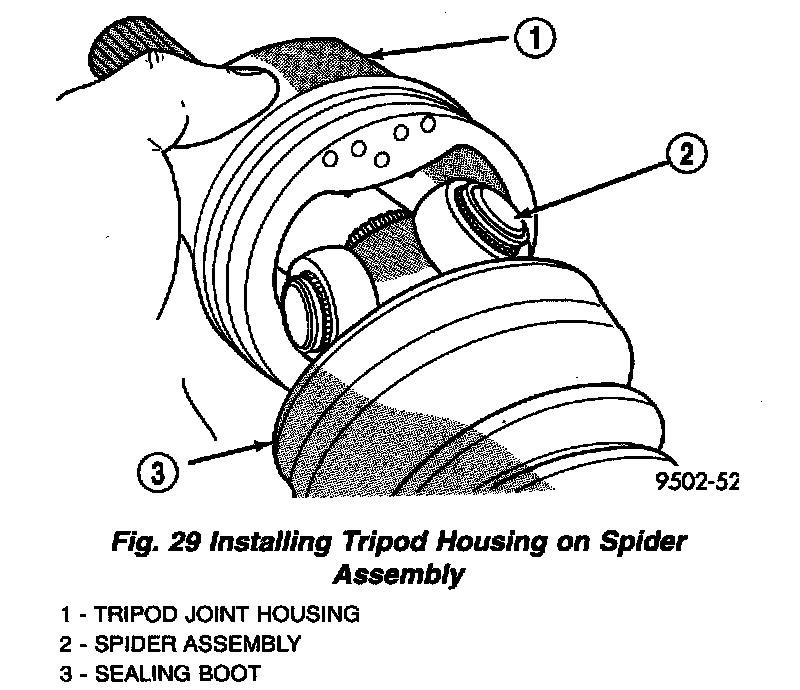 5. Align tripod housing with spider assembly and then slide tripod housing over spider assembly and interconnecting shaft (Fig. 29).