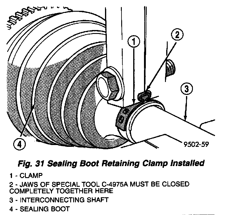 7. Clamp sealing boot onto interconnecting shaft using crimper, Special Tool C-4975-A and the following procedure. Place crimping tool C-4975-A over bridge of clamp (Fig. 30). Tighten nut on crimping tool C-4975-A until jaws on tool are closed completely together, face to face (Fig. 31).