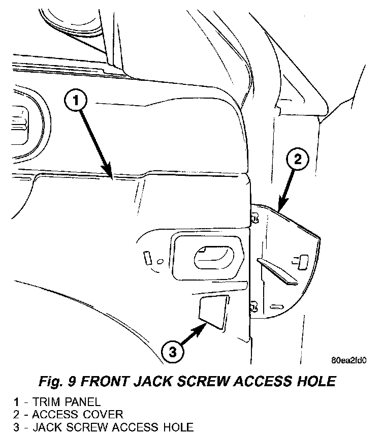NOTE: For minor adjustments (up to 3mm), rear up stop can be accessed without removing the door trim panel. Remove the reflector plate (Fig. 8). The jackscrew nut also acts as a minor adjustment up stop. Loosen the nut and move up or down to achieve the correct height. Do not adjust the jack-screw, as this will affect the inboard/outboard adjustments.
