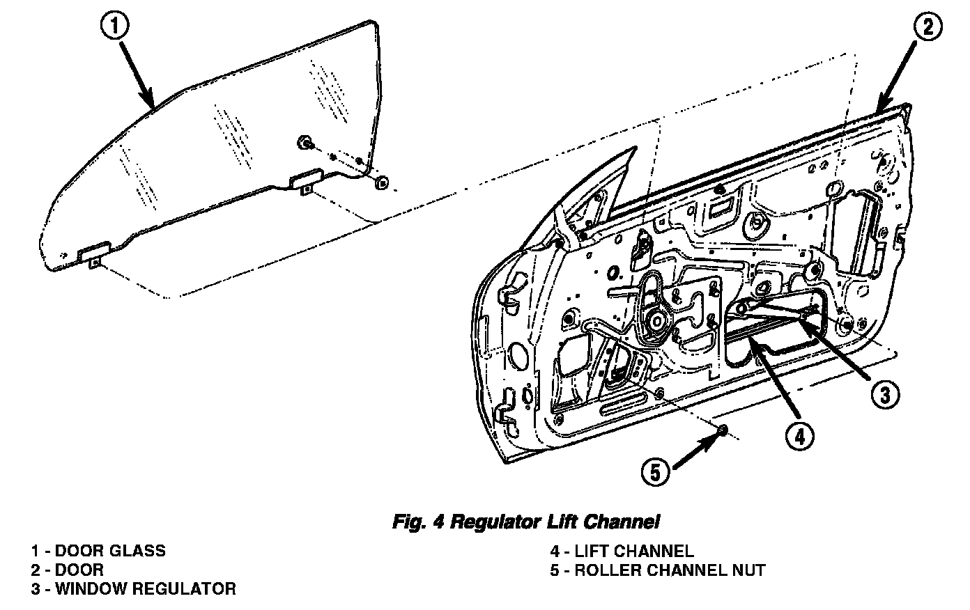 2. Move window regulator into position in door and engage bolt heads into key hole slots in inner door panel reinforoement and tighten bolts.
